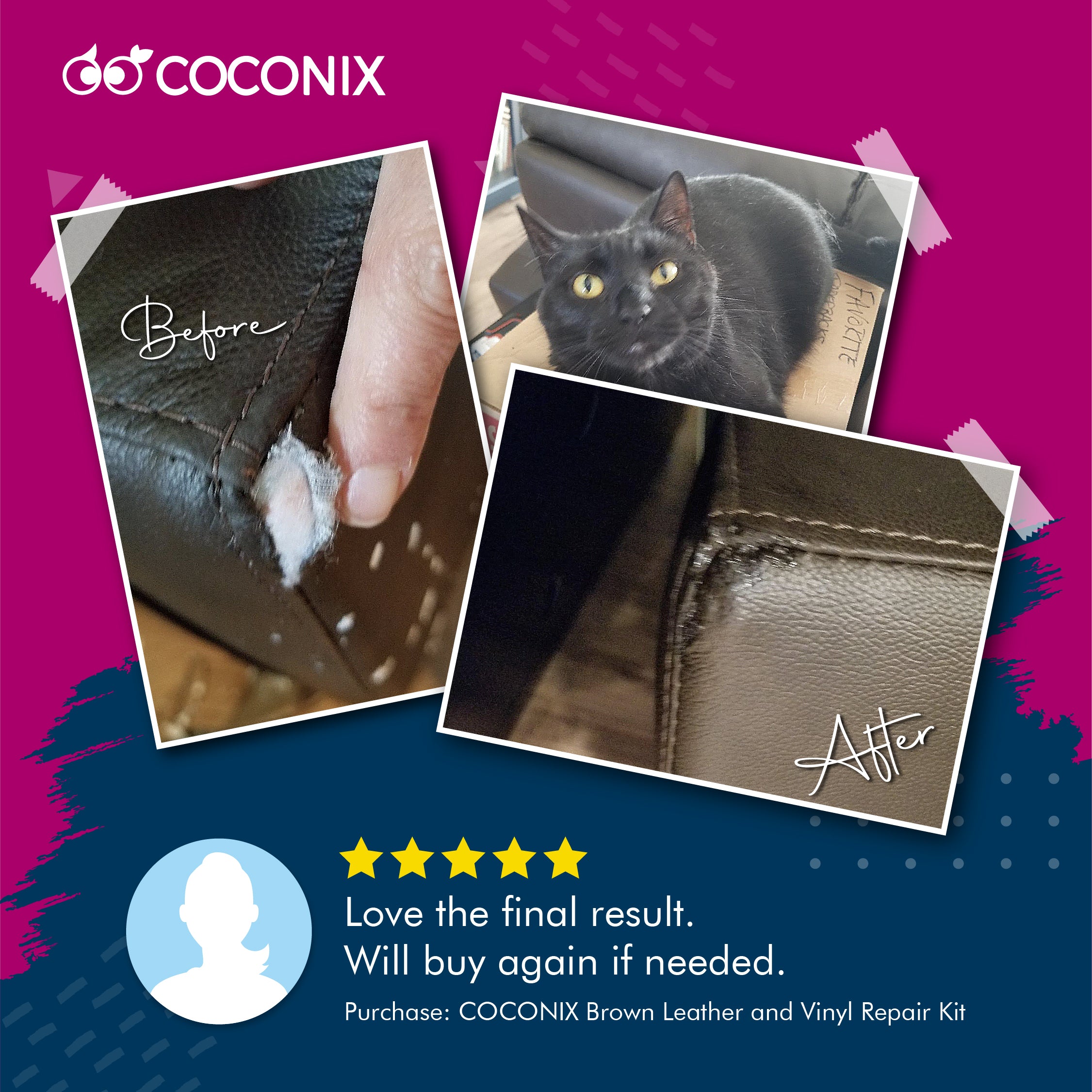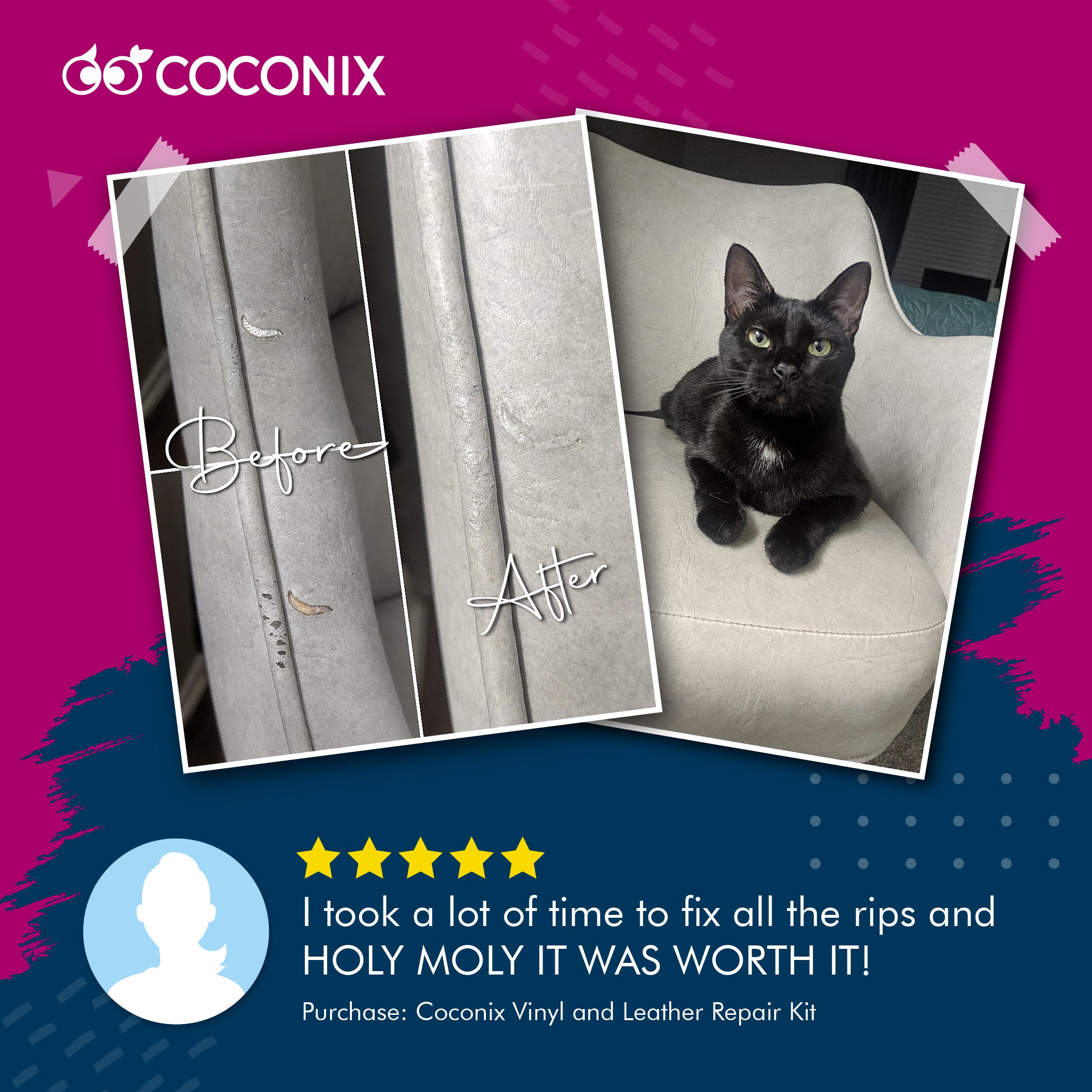 I had a large slit in a bar stool chair seat cushion and after reading about several products and looking at the reviews I decided to give the Coconix repair kit a try. It worked great and the upholstery looks like new! A perfect color match and texture. The result exceeded my expectations!