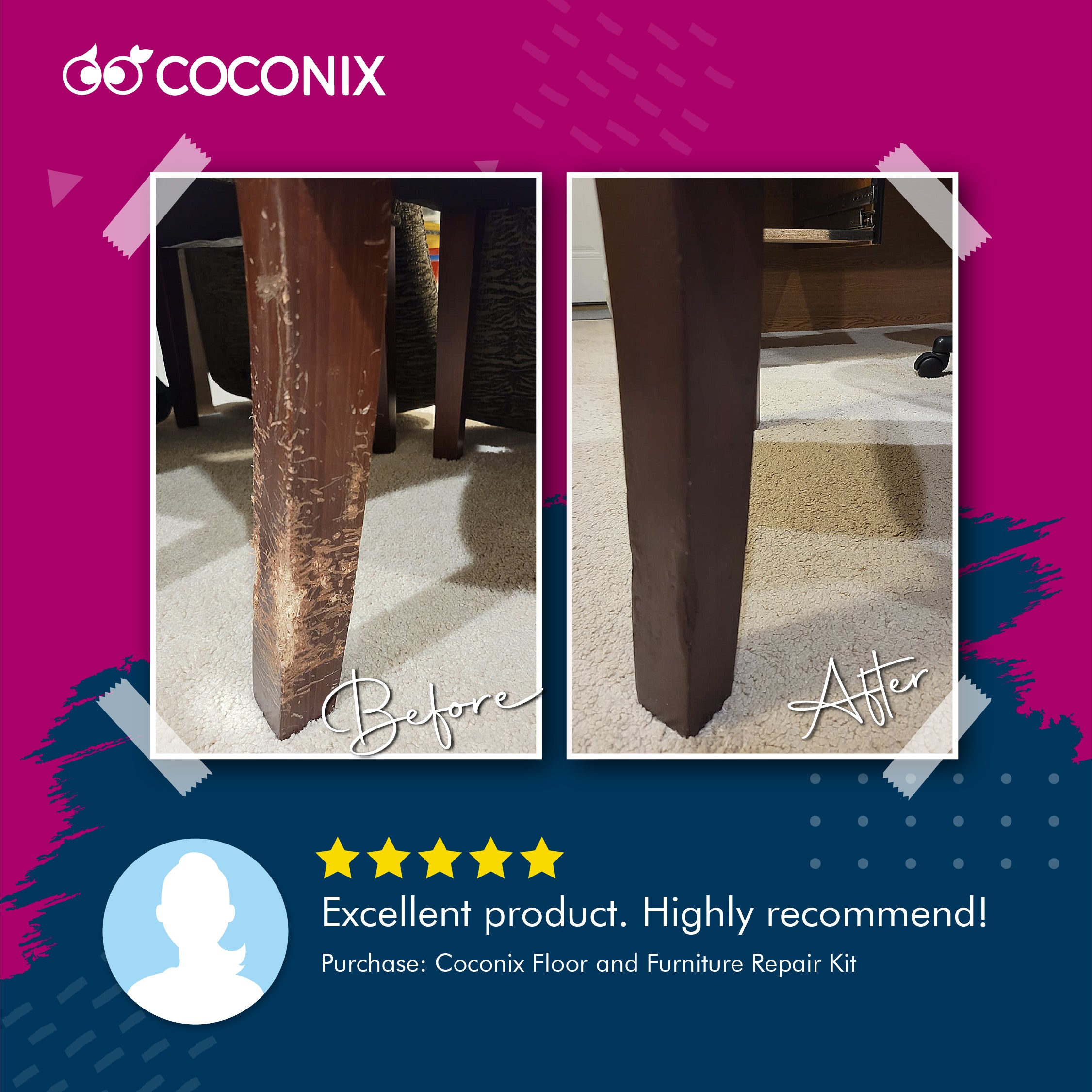 The product and customer service is amazing! The scratch/dent in our floor is gone. Upon opening each color to mix,the caps came off, probably our fault, and weren't able to be put back on. We just covered each with foil but the company/customer service insisted on sending us a new pack. We so wish other companies would learn from this one. What a nice experience!! Thank you so very much Coconix.